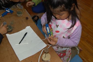 今日のお楽しみドングリ工作。いろいろなドングリ他樹木の部位を材料に、ホットボンドを使って思い思いの作品を作っていきました。なんだか子どもたちより保護者の方が力が入っていたような気がします。