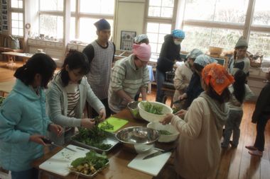 野草の料理は、かき揚げ、あえ物、餃子、ピザ、ふりかけの4種類を作りました。他に、釜戸での羽釜炊飯をしました。参加者(大人の参加者中心)で、各々好きな役割に分かれて料理を開始しました。