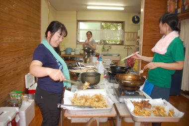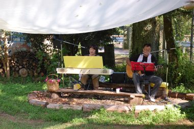 | 天気は、活動日和の快晴です。参加者が揃うまでも、スタッフは受付、駐車場係、素麺流しの準備と忙しい時間です。あかとんぼは、ミニコンサートのリハーサルをしています。 | |
