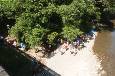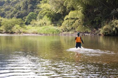 | ライフジャケットの着用については、実演でしっかりと説明をしています。オリエンテーション終了後、さっそく河原に降りて行きます。 | |