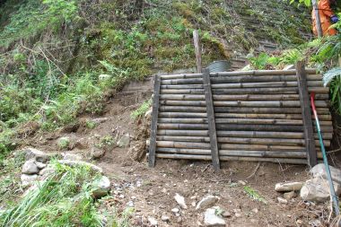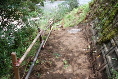 7月23日(参加者3人) 梅雨の大雨により、河原への昇り降りする道が壊れていてので補修をしました。角材とい竹で法面を作り、道から足を踏み外さないように簡易柵を設置しました。これで、小さい子どもの昇り降りも一安心となりました。