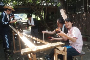 | 4mの竹を二割にして素麺流しのレールを作成。 | あまった竹でお椀作り。 |