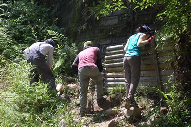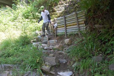 7月23日に開催する『川をたのしく親しもう』では、五十鈴川で川に親しむために、「ネイチャーゲーム」や「川あそび」、「川虫の観察」をおこないます。五十鈴川に昇り降りする道が、昨年の台風による増水で壊れてしまったので補修をしました。これで、小さい子どもの昇り降りも一安心となりました。