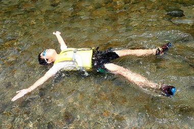 | ホースを使って、水中の音(ゴボゴボ)を聞きます。 | 両手両足の大きくひろげ全身の力を抜き、川の流れに身を任せます。 |