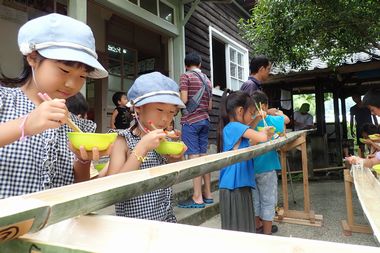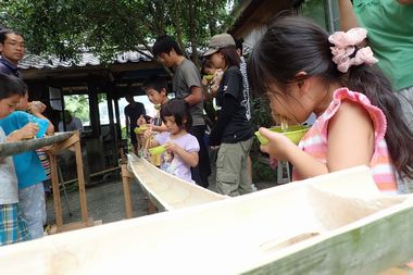 | 総延長15mの竹レールを素麺やトマト・キュウリ・ブドウ・ミカンが流れます。 | |