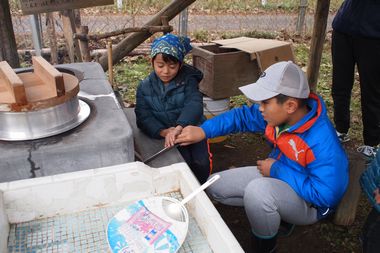 炙り秋ソーセージ生地作りを釜戸炊飯の2組に分かれて昼食の準備を行いました。炙り焼きソーセージが焼きあがったら昼食となりました。