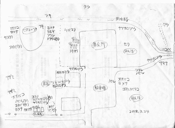 生えている野草を講師の成迫さんが事前に調べてくれました。スタッフ2名が野草マップの作成し、野草調理の下ごしらえ を行いました。