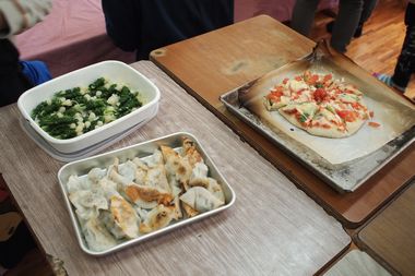 野草の観察と食べる分だけの収穫をして名前を覚えます。その後、収穫した野草を使って、餃子、天ぷら、白和え、おひたし、ピザを参加者みんなで作り食べました。