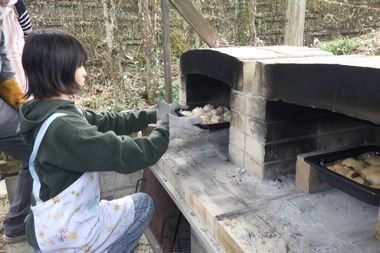 形成後の二次発酵が終わったパン生地は、屋外のパン窯で焼き上げていきます。