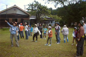 スクール生が集まり、いよいよecoスクールが始まります。横山理事長からのあいさつの後、事務局からの連絡事項などが終わり、参加者同士仲良くなっていただくため、ネイチャーゲーム・リーダーの方たちによる「はじめまして」が行なわれました。カードに複数の自然に関する質問事項があり、その質問事項を使って会話をして行きます。会話が終ると別の人に別の質問をして行きます。そうする事で初対面同士でのコミュニケーションをとります。最後に気になった回答をそれぞれ発表して、その人を間接的に紹介をします。