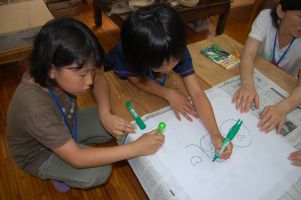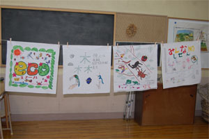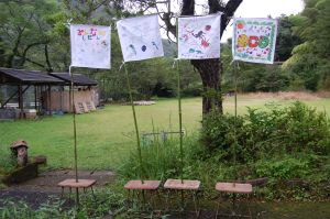 朝のネイチャーゲームの4班に分かれて、ecoスクールのシンボル旗を作りました。各班それぞれのecoスクールへのイメージを現す旗が出来上がりました。この4枚の旗は、ecoスクールの時に掲げることになります。