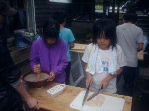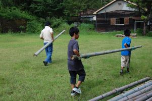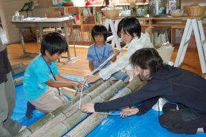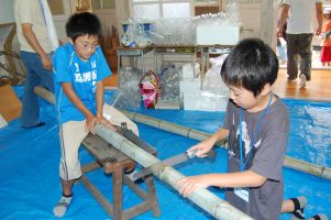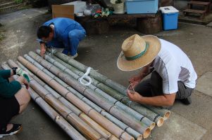 イカダ作りの説明を横山理事長が行なった後、グループ毎に分かれてイカダ作りの作成がはじまりました。外は暑いため室内にシートを敷いて作業を行ないました。お昼も忘れイカダ作りに熱中してしまい、お昼ご飯が12時30分からとなりました。他に竹オールも作りました。