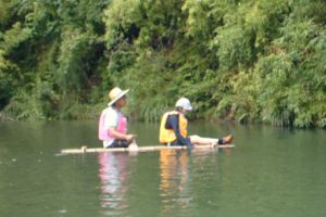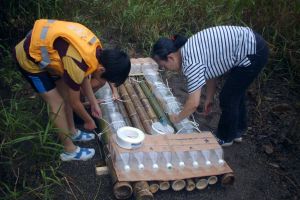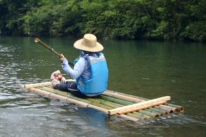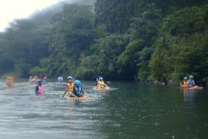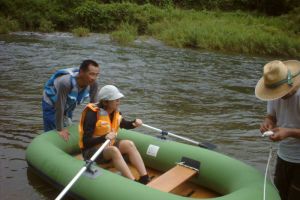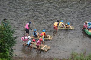 最初に、川下り到着地点から道まで登る箇所の草刈をしました。その後ecoスクールで予定している約500mの距離を竹イカダとゴムボートで川下りをしました。雨により水量がいつもより多かったため流れが早かったため到着地点に思ったより早く着いてしまいました。川の水量が減っていないと困りますので、ecoスクール前一週間位は、雨の無い日が続くことを祈るばかりです。竹イカダは、大人二人でも何とか浮きますが二人乗りとなるとバランスをとるのが難しくなります。