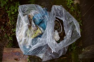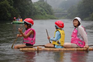 ゴール地点までの間を行ったり来たりしながら、川岸の木枝に引っかかっているビニールを中心にゴミを拾いました。途中から雨も降りだし、気温・水温とも低めであったため、あまり川の上で長いができず約50分間の川下りながらの清掃活動となりました。ゴール地点で竹イカダを分解して森の学舎に、イカダと拾ったゴミを持ち帰りました。竹イカダでの川下りは、子供たちと一緒にお母さん方も大はしゃぎでした。