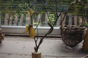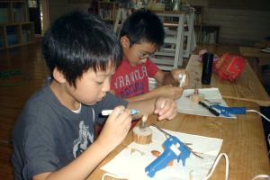 昼食後は、川遊びを予定していましたが、雨が降っていて気温もあがらなかったので、ネイチャークラフトを実施しました。参加者は、自然の工作材料を使って思いおもいの工作を完成させました。