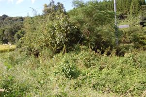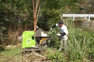 手鎌と造林鎌で草を刈り、鋸で竹や低木を切り、粉砕機を使ってチップにして、川沿いにある茶の木の根元に撒きました。畑として使っていた時に端に植えたと思われる茶の木は、背の高い草等で、光が当たらなかったのでしょう、枝だけで茶葉が上部に少ししか付いていませんでした。