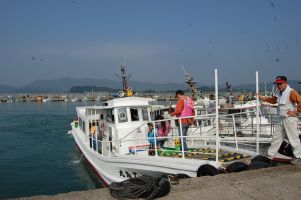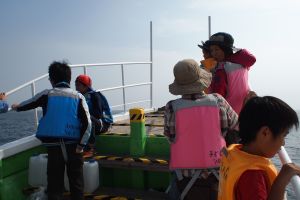 | 庵川漁港から乙島丸に乗って海沖に出発です。 | |