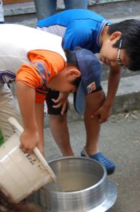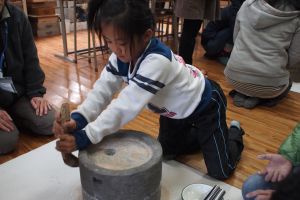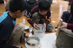 小麦挽きには、2個の石臼を使いました。どちらの石臼も昔実際に使われていた物です。大人でも大変な石臼廻しを、子供たちががんばって廻しました。石臼で挽かれた麦粉をふるいを使って小麦粉を集めます。ふるいに残った荒い麦は再び石臼で挽いて細かくします。2時間かけて約750gの小麦粉を作ることができました。