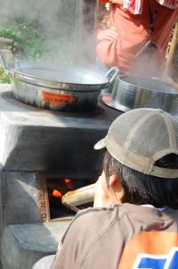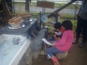船を降りて、森の学舎の釜戸で塩をつくために、森の学舎に移動しました。昼食後、海水から塩をつくるための手順の説明があり、いよいよ塩づくりの開始です。