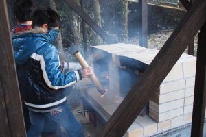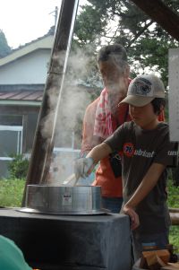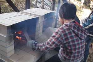二連式のパン窯を熱します。火をつけるところからパン釜の天井裏が白くなるまで、約1時間かかります。子どもたちは、熱く煙を目に沁みる窯の前で奮闘してくれました。