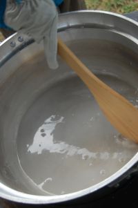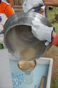 ![]() @鍋(羽釜)に海水を入れます。今回は、海水5リットルから塩を作ります。 |