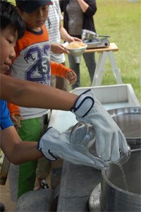 子供たちが中心となって釜戸を二口使用して、計10リットルの海水からの塩づくり作業を進めました。シャーベット状に塩が濃縮された海水をろ過し、鍋で炒め乾燥させ、約220gの塩を作ることができました。