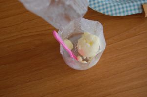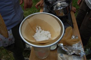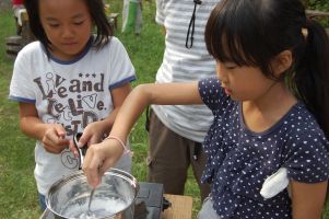 酪農体験の後は、バター作りとカッテージチーズ作り実演と試食がありました。バター作りは、牛乳50ccと生クリーム50ccを20分から30分間シェイクして、固形化した物がバターです。できあがったバターに塩を少々加えて、手作りバターの完成です。手作りバターは日持ちしないため、その場でパンに付けて食べました。カッテージチーズは、搾乳した牛乳4リットルを90度まで熱し酢を適量加え、かき混ぜるとできあがります。醤油を少し垂らして試食しました。