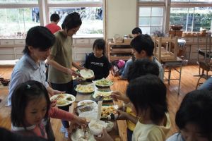 収穫した4種類の野菜を使ってお昼のおかずを作りました。サトイモは味噌汁と天ぷら、ジョウガは甘酢漬け、ゴボウはかき揚げ、ジネンジョは、とろろと天ぷらにしました。そして、バイキング方式で各自好きなものを食べました。最初になくなった(一番人気?)のは、とろろでした。