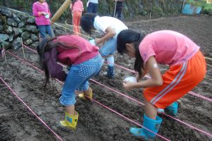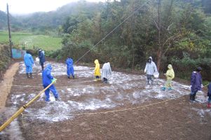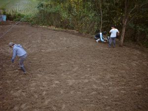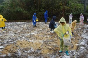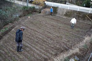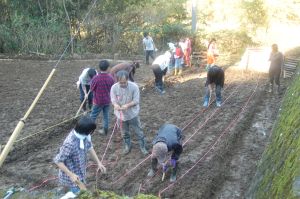 昼からは天気も回復し、午後やや遅れて種まきをはじめました。種をまく筋の目安として30cm毎に色テープを張り、テープに沿って種をまいていきます。その後、まいた種の上に土をかぶせていきました。10日後の発芽が楽しみです。