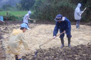 雨が降ったり止んだりの天候の中、畑の周辺に雨水を流すための溝を掘りました。掘った土は畑へ入れ、耕耘して草の根を取りながら平らに成らしていきました。元々は田んぼたった場所を畑として使っていたようなので土は粘土質です。