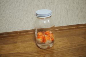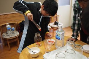煮沸消毒したビンに、軽く洗ったイチゴ100gと水200ccに、大さじ一杯の砂糖を加えます。ビンに雑菌が入らないように、おしゃべりを止め、トングを使って慎重に作業をしました。なんだかいつになく緊張感がありました。