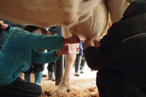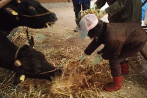 バターの原料である牛乳のことを考えるための酪農体験です。牛乳は、乳牛の体の一部である血液から作られることから、動物の命を削った食べ物であることを知り、そんな牛の事を思い考えるための体験活動です。