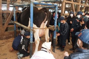酪農体験をお願いしたのは、延岡市松山の矢北牧場です。現地集合で、道に迷ったスクール生もいましたが、全員無事到着して、酪農体験(餌やり、牛舎の清掃、搾乳)を行いました。 最初、子供たちは大きな牛に腰が引けての餌やりでしたが、徐々に慣れて、搾乳の時には牛に平気で触れるようになっていました。