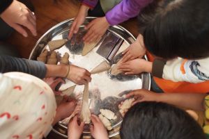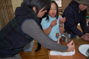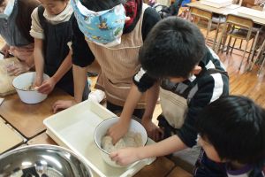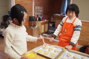 | 皆で一緒にパンの形づくり | 焼く前の仕上げ |