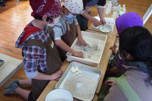 7回目のスクールで学習し自宅で育てたイチゴ酵母を持ち寄り、4回目のスクールで作った塩、7回目と8回目のスクールで石臼で挽いた小麦、今日作ったバターを使って、小麦の配合や酵母の種類を少し変えながら4種類、全部で6玉のパン生地を作りました。その後、1次発酵へとまわします。自家製の天然酵母菌であるため、市販のイースト菌のように膨らみません。