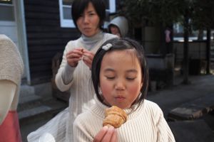 | 形成したパンを窯へ投入 | 焼きたてのパンを試食 |