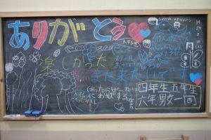 パン焼きと試食が終わり文集の原稿も書き終わり、閉校式となりました。閉講式では、横山理事長から、これから食べ物をとる時は、食材がどこから来たのか、外国から輸入された食べ物は、輸送に多くのエネルギーが使われ環境への負荷が大きいこと、食材に多くの方たちが関わってきていることへの感謝、そして自分ができる環境への取り組みを考えて欲しいと話がありました。また、子どもたち全員が黒板に寄せ書きをしてくれました。