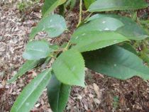 ![]() タラヨウの葉(モチノキ科) 葉の裏側を尖ったもので文字を書くと、黒く変色して、文字が浮き上がります。このことから、葉書の語源になったといわれています。 |