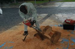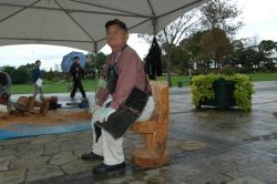 その他に、チェーンソーを使って、杉の丸太から椅子作りの実演を行いました。杉の椅子に腰掛けているのは、みやざき森づくりボランティア協議会の圖師会長です。