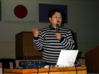 ![]() 「人と森との関わり」について 講演するニコルさん |