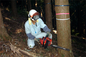 ![]() 雑下木があるとスギを伐採倒木した時に危険であり、玉切りや搬出が難しく危険になるので、邪魔になる雑下木を切って伐採箇所から除きます。 |