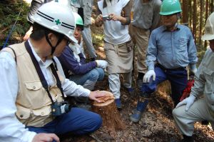 ![]() 伐採した切り株をチャックします。受け口・追い口・つるがキチンとできているかを全員で確認して、伐採作業の問題点を把握しました。 |
