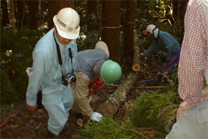 林業は、とても危険な作業であることを改めて感じました。現在は、森づくりボランティアは、広葉樹の植樹や育林が主であるため、スギの手入れは行いません。しかし、スギ材価格の低迷や林業後継者が少ないために、スギ山が放置され災害に弱い山になっている実態もあります。近い将来、除伐や間伐等のスギの手入れ、スギ材の販売促進などにも、ボランティアが介入するかもしれません。しかし、自然環境保全の大義の元で、主体性を持たないボランティアとして、スギの手入れ等をすることは、とても危険なことだと思います。