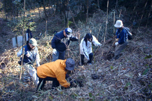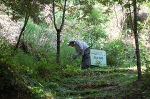 みやざき森づくりボランティア協議会が、一般参加者を対象にした初めての講演会「森から海までシンポジウム」を記念して、畠山重篤さんと中村文明さんも一緒になって植樹をしたフィールド(ロキシーヒル内の「みやざき森づくりボランティア協議会の森」)の下草刈を実施しました。一緒に参加した宮崎グリーンヘルパーの会と水源の森づくりをすすめる市民の会は、ロキシーヒル内にある自団体フィールドの下草刈をしていました。その間に、みやざき森づくりボランティア協議会の森は狭いため、各団体が自フィールドの草刈りをしている間に、2人だけで下草刈は終了しました。