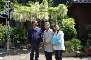 冨吉さんに案内してもらったのは大川地区で、地元料理がだされるループ亭(廃校となった分校)を中心に、棚田が綺麗に整備された日本の原風景を感じ、昭和63年(1988年)に廃止となった山野線鉄道跡地には線路が残っていて今にも汽車が走ってきそうな気がしました。途中で、2件のお宅でお茶を呼ばれ、1件のお宅ではお庭のお花を拝見させていただきました。お茶を呼ばれたお宅では、手作りの漬物や自家製小麦で作った手作りパンをご馳走になりました。