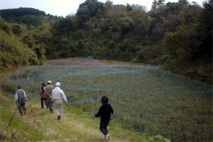 愛林館が主催している水源の森づくりをしている森林の見学をさせていただきました。従来のスギの間伐に代わっての巻き枯らし間伐(表面の皮をスギが立ったままで剥いで立ち枯れさせる方法)の現場と、環境省のかおり風景100選に選ばれている大学山や、現在手がけている森、水俣川の水源のひとつである寒川水源を案内してくれました。また、日本の棚田百選に選ばれた寒川地区の「棚田のあかり」についての説明など、愛林館と地元地域やボランティアとが一緒になって実施している活動を学びました。愛林館が手がけた森林面積は、21haに達しています。