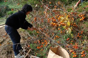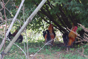 | 山柿をたくさん千切りました。 | 人懐っこい放し飼いの鶏もいました。 |
