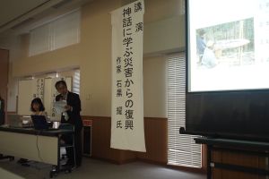 「神話に学ぶ災害からの復興〜森の破壊神から守護神になったスサノオ〜」をテーマに、大阪在住で勤務医で小説家の石黒耀さんの講演がありました。神話の中には、自然災害を物語にして後世に語り伝えるものが多くあるとの話がありました。沖で漁をしていた漁師が村に戻ってきたら自分の住んでいた村がなかったことが、浦島太郎物語として神話になった。おそらく、地震による地殻変動で陸地が海に沈んだと考えられる。海彦山彦の話で海彦が洪水に呑まれる場面は、津波による災害だと考えられる。等、文字がなかった時代に脚色され物語となった。神話や物語をそのような観点から読んでみると、先人が未来へ伝えようとした大事なことが多くあることが理解できます。