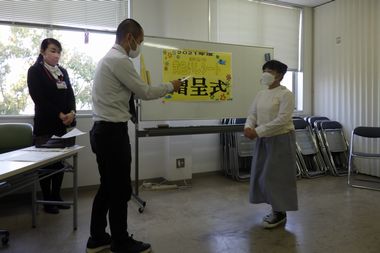 イオン黄色いレシートの贈呈式に、横山理事が出席しました。イオン日向店で16年間にわたり支援を受けています。 今回(2021年度)は、17,100円のギフト券をいただきました。