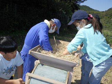 田んぼ復活プロジェクトから8人、ecoスクールから3人、他一般3人、スタッフ6人が稲刈りと脱穀に参加しました。